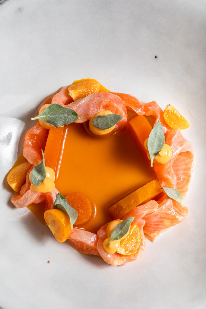 Nach dem zweiten Espresso und der ersten Fotoshooting-Runde gibt’s dafür erst mal Essen. Lukas Lacina, der seit zwei Jahren die MAST-Küche gemeinsam mit einem dreiköpfigen Team schupft, biegt freundlich lächelnd mit roh gebeizter Lachsforelle, Chioggia-Rübe, Physalis und Chilimayo und kalten Schweinebraten mit Gurke, Sesam und Szechuan Pfeffer um die Ecke. Was Steve und Matthias beim Wein wichtig ist, gilt auch fürs feststoffliche Programm. Lacina arbeitet klar produktbezogen, nichts soll unnötig geschmacklich verfälscht werden, die Rohprodukte stammen überwiegend von kleinen Bio-Produzenten – die, ganz im Sinne der Nachhaltigkeit, vorwiegend aus der näheren Umgebung kommen. Bei der Komposition seiner Gerichte orientiert er sich nicht wirklich am Weinangebot, er achtet lediglich auf feine Säurekomponenten und darauf, das Menü möglichst leicht zu halten. „Die Jungs finden da schon den passenden Wein dazu“, grinst er.