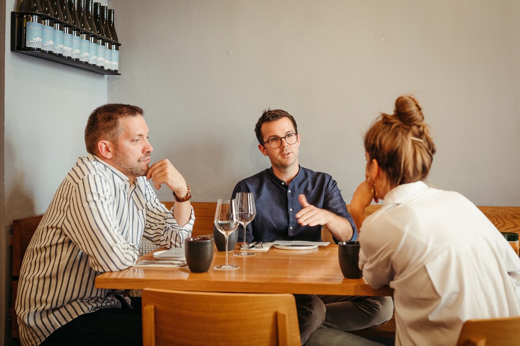 Man könnte jetzt gefühlt noch ewig weiterplaudern mit den beiden, weil sie leidenschaftliche und humorvolle Erzähler sind, und weil sie eine so präzise Vorstellung von dem haben, was sie tun, und worauf sie lieber verzichten. Aber in einer Stunde werden die ersten Abendgäste eintrudeln, und das Küchen- und Serviceteam wird sich gleich noch zum gemeinsamen Essen hinsetzen. „Aber keine Eile!“, sagt Matthias, und schiebt das angetrunkene Glas 2020er Chenin Blanc Effusion Anjou von Patrick Baudouin über den Tisch. Und schon ist man wieder MAST-mäßig abgekoppelt von Zeit und Raum.