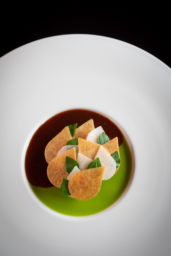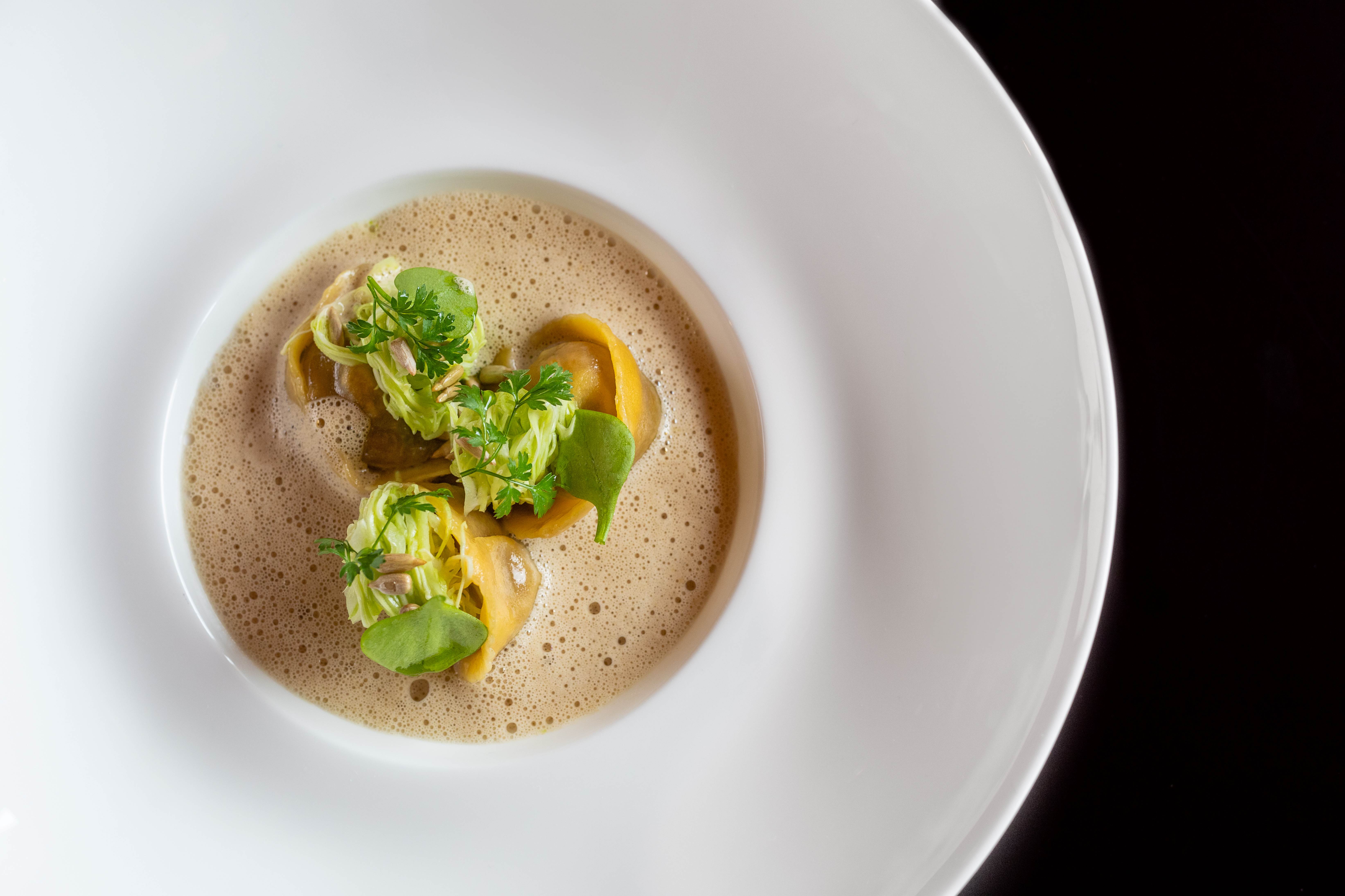 Dabei, erzählt er, und streicht mit den großen, kräftigen Händen über die tiefschwarze Tischplatte, wollte er gar kein Koch werden. Aber Glantschnig ist ein Gastronomenkind, aufgewachsen in und mit dem elterlichen Stotterhof in Untervellach. Der Vater hätte ihm damals nur zwei Ausbildungsoptionen gelassen: Gastronomielehre oder Holztechnikum in Kuchl. Glantschnig wählte Kuchl. Nach dem Abschluss 2008 entschied er sich dann aber doch noch für einen Karriereweg in der Gastronomie. Auf die Lehre bei Heinz Hanner im gleichnamigen 3-Hauben-Restaurant in Mayerling folgten Praktika bei Harald Wohlfahrt, Sven Elverfeld und Klaus Erfort, sowie ein einjähriges Engagement bei Sternekoch Jean- Georges Klein. 2014 erkochte Glantschnig an der Seite von Manuel Ressi im Gasthaus Plamenig die erste Gault-Millau-Haube, 2015 übernahm er die Position des Küchenchefs im Waldhof Resort Scheffau in Tirol, ab 2018 folgte der Feinschliff bei Jan Hartwig. Als der 2021 im Bayrischen Hof seinen Hut nahm, zog es Glantschnig ohne Masterplan für die Zukunft zurück nach Kärnten. Die Zukunft kam dann in Gestalt von Samira und Hermann Rauter, die aus dem ehemaligen Dorfwirtshaus mit Unterstützung von Architekt Günther Domenig den Neusacherhof gemacht hatten, und einen Küchenchef suchten.