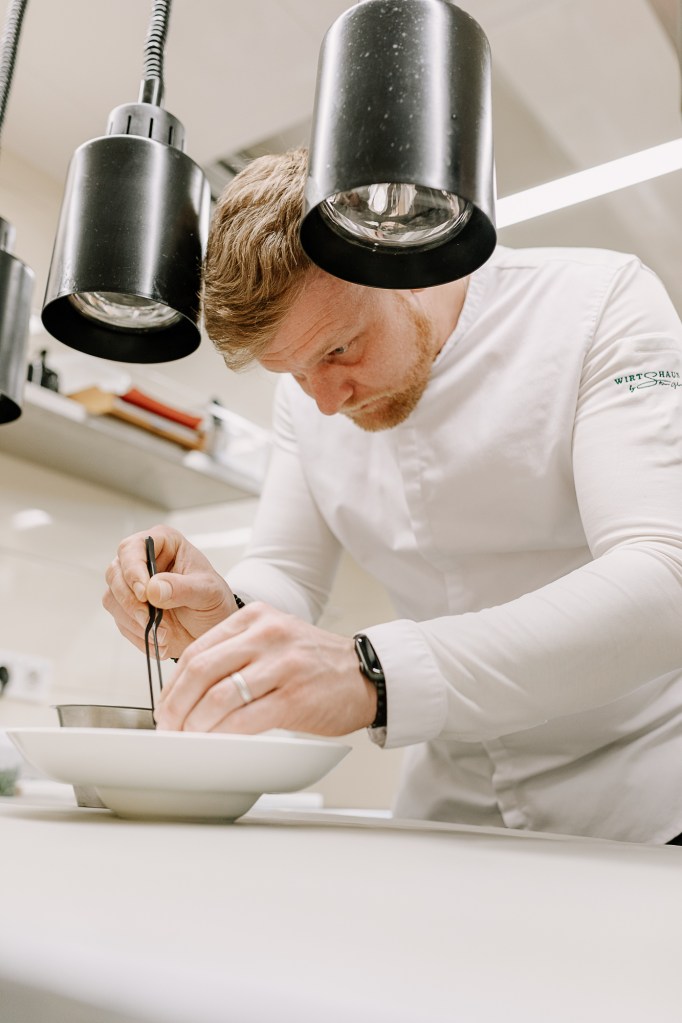Auch umkreisbedingt, weil: die Dichte an Haubenlokalen am See ist hoch. Hannes Müller hält im Restaurant Die Forelle vier Hauben, Jakob Lilg im Löwenzahn drei, das Strandhotel am Weissensee zwei. Als langjähriger Sous Chef von Jan Hartwig im 3-Sterne-Restaurant Atelier im Bayrischen Hof in München hat Glantschnig aber jedenfalls das Rüstzeug dazu, in der Michelin-Stern-Liga zu spielen. Den Willen sowieso.